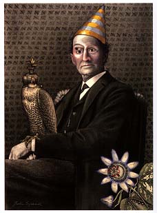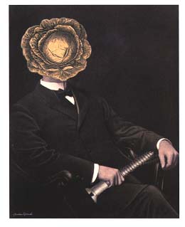 Wrong. In a Joycean play on words, the ever-irreverent Speed plays upon both meanings of altar/alter. A set of "ancestor" portraits would suggest a sense of reverence; therefore the word would be "altar". However, these works of art are assemblages Speed has crafted fiom hundreds of images and subsequently "altered" by Speed's hand and imagination. (left: Julie Speed, Cabbagehead, 2000, brush and gouache, collage and engraving, 7 x 5 1/2 inches)