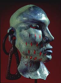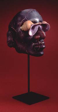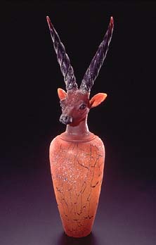 William Morris' own work bears none of Chihuly's flash and color. His series of work at the Pilchuck Glass School the past 20 years are archaeological inspirations borrowed from various cultures throughout time, each addressing a relationship between humans and their environment. That relationship is referenced in works with imagery drawn from the ancient cave paintings of Lascaux, France, the bones and primitive tools of an ancient Ice Age, Egyptian funerary jars or the ceramic mastodons, bulls and other creatures unearthed from the 3,000 year-old Amlash graves of Iran. (right: Canopic Jar, 1995)