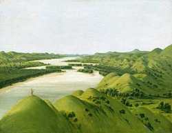 In 1832, Catlin made an epic journey that stretched more than 2,000 miles along the upper Missouri River. St. Louis became Catlin's base of operations for the five trips he took from 1830 to 1836, eventually visiting 50 tribes. (right: George Catlin (1796-1872), River Bluffs, 1320 Miles Above St. Louis, 1832, oil on canvas, 11-1/4 x 14-1/2 inches, Smithsonian American Art Museum. Gift of Mrs. Joseph Harrison, Jr., 1985.66.399)