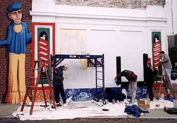 The mural, sketched collaboratively by the dozen junior and senior students in Winer's class, depicts many of the characters appearing in the cinema's famous magic show, plus clowns, jugglers and musicians, and a giant puppet announcing the show. A small black puppy, off to one corner of the scene, sits on the ground "in front of the mural" casting a shadow on its trim.
