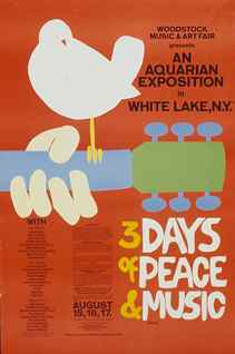 Later posters, such as those created by British artist Jamie Reid, were instrumental in creating the visual' look' of the punk rock movement in the late .1970s, promoting bands like the Sex Pistols and the Clash, as well as New York's famous CBGB nightclub. Reid has been described as the "arch anarchist artist" and was responsible for creating the original artwork for the Sex Pistols' Anarchy in the UK. (right: Arnold Skolnick; 3 Days of Peace and Music at Woodstock Music and Art Fair, White Lake, New York, August 15, 16, and 17, 1969; 1969; offset lithograph; 36 11/16 x 24 inches)