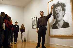 Note: Both photos show Davidson Gallery Director Brad Thomas explaining the exhibition to one of numerous groups of school children who have toured it.