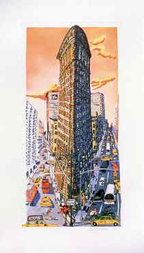 Created between 1956 and 1999, the works reveal the practiced hand of a master draftsman who has experimented with an array of printmaking techniques ranging from delicate softground etchings to an eight-foot-high woodblock print, to 3-D graphic versions of "sculpto-pictoramas," the large-scale environmental works for which Grooms is best known. (left: Red Grooms, Flatiron Building, 1996, etching, soft ground and aquatint; 45 x 26 inches, Courtesy of the Tennessee State Museum. © Red Grooms)