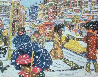 Grooms introduced the theme of the city in 1962 with his first commissioned print, Self-Portrait in a Crowd. The image of a jaunty, striding figure wearing a stovepipe hat on a busy street signals the artist's confidence in his quickly rising art career. In 1967, Grooms created his first life-size installation, inspired by nostalgia for the "Windy City" of Chicago, where he had studied art in the late 1950s Avenue. Four years later in 1971, Grooms portrayed the densely swarming streets of New York City in his first print portfolio No Gas. In later works, Grooms continued to portray New York with exaggerated street perspectives, outlandish people and a high degree of nervous energy.