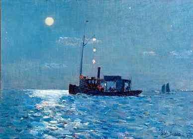Consortium members are: The Art Complex Museum, Duxbury MA; The Bennington Museum, Bennington, Vermont; Cape Museum of Fine Arts, Dennis, MA; Danforth Museum of Art, Framingham, MA; Farnsworth Museum and Library, Rockland, ME; Fitchburg Art Museum, Fitchburg, MA; Florence Griswold Museum, Old Lyme, CT; Fruitlands Museums, Harvard, MA; Fuller Museum of Art, Brockton MA; Lyman Allyn Art Museum, New London, CT; Mattatuck Museum, Waterbury, CT; New Britain Museum of American Art, New Britain, CT; Newport Art Museum, Newport, RI, Provincetown Art Association and Museum, Provincetown, MA. (right: Childe Hassam (1859-1935), Isle of Shoals, Moonlight, 1890, oil on canvas, 12 x 9 inches, Collection of the Fitchburg Art Museum)