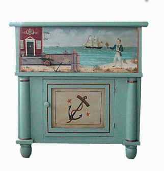 "In the Beginning," an exhibition of Cahoon furniture decorated between 1930 and 1960, includes chests, commodes, tables, chairs and trays. These objects provided surfaces on which the Cahoons painted a variety of Swedish peasant, Pennsylvania-German and early American designs. Eventually, they also went beyond such derivative ornamentation and painted scenes of their own invention, including Cape Cod-inspired designs ranging from beach scenes with shorebirds and shells to fanciful, often humorous compositions with mermaids and sailors.