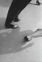 What is perhaps most striking about these images, however, is their often in-your-face intensity, which is achieved through the combination of subject and approach. The New Yorkers of these photographs distinguish themselves from the denizens of any other city in their dramatic extremes and appealing idiosyncrasies. Cockeyed camera angles, inexact focus and grainy exposures unbalance viewers at the same time that these techniques deliver us to the very center of the action. These were photographers who as a rule eschewed large-format cameras in favor of the small and portable, and they worked mostly with ambient light. As in the city itself, it's sometimes hard to make out exactly what is happening in the pictures -- everything seems to be happening so fast, the senses are overloaded. The shapes and contrasts of the people and the buildings, pitched at precarious angles, always in motion, are full of mystery.