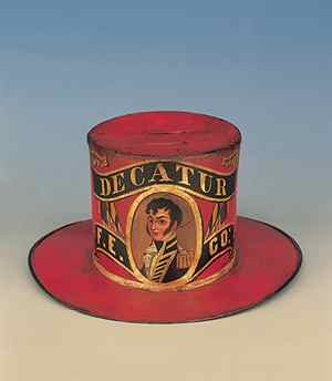 (above: Fireman's hat, ca.1850, probably Philadelphia, painted and gilt felt. The Colonial Williamsburg Foundation, The Abby Aldrich Rockefeller Folk Art Museum)