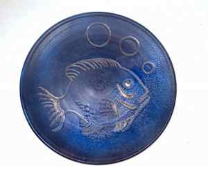 fish plate with silver inlay, 1946. Earthenware with alkaline blue glaze,