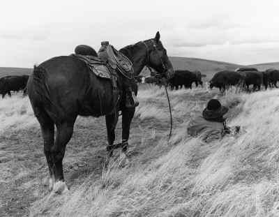 But photography has also brought questions: "Because I live in Montana and because photography is in many respects a solitary profession, I have often felt isolated. How does such-and-such photographer feel? I've wondered. How do other photographers who I admire get up in the morning and ready themselves for picture making?" To answer these questions, Markus convinced several magazines to assign him to interview other photographers. He interviewed David Bailey, William Klein, William Clift, Robert Doisneau, Willy Ronis, Edouard Boubat, Max Dupain, and others. He describes the benefit of these experiences in this way: "Each of these encounters has taken me out of my world long enough to be able to return to mine with renewed eyes." (right: Big Springs Ranch, Bruneau, Idaho, photograph, by Kurt Markus)