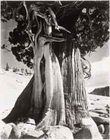 Weston claimed no documentary or historical intent with his Guggenheim project. It was purely an aesthetic mission, exploring "the universality of basic form" in a region he knew and loved. Whether in the canyons of Death Valley, the snowfields of Yosemite, or the forests of the Pacific Northwest, these travels had a liberating, energizing effect on Weston. He experimented with landscape as never before, and his compositions opened up, becoming freer and less tightly controlled than in the intimate studies that characterize his earlier work. Weston considered his fellowship years as the capstone of his career. (right: Juniper, Sierra Nevada, 1937, Photograph by Edward Weston. © 1981 Center for Creative Photography, Arizona Board of Regents)
