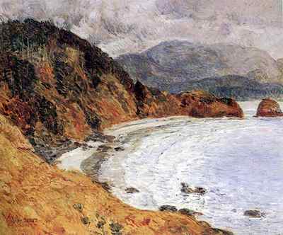 Frederick Childe Hassam was born in Dorchester, Massachusetts, in 1859 to middle-class parents with deep New England roots. He studied painting in Boston and in Paris at the Académie Julian and was exposed regularly to the works of the French Impressionists and Neoimpressionists. By the time he returned to America in the fall of 1889, he had developed a fully Impressionist style focusing on urban scenes painted with broken brushwork and a high-keyed palette. He translated this style to his American subjects and quickly became known for his lively Impressionist images. Traveling and painting the motif at hand also became a hallmark pattern of Hassam's career, and it is in this context that he undertook his trips out West, first to Oregon in 1904 and 1908, and then to California in 1914-15.