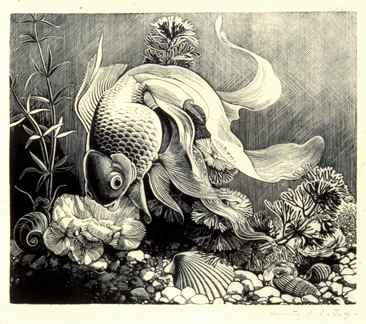 Lathrop and her sister Gertrude, a sculptor, cared for a menagerie of domestic and wild creatures in their home and studio, both for companionship and as models for their art. For the remainder of her career, Lathrop wrote many books based on these and other animals. (right: Dorothy Lathrop (1891-1983), Goldfish, 1944, engraving, woodcut in ink on Japanese paper, 9 3/4 x 10 3/4 inches. Albany Institute of History & Art. Gift of the Albany Print Club)