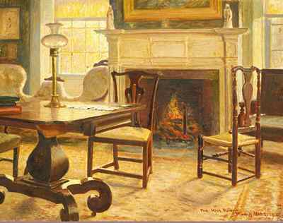 (above: Woodhull Adams, Miss Florence's Parlor, 1910, Florence Griswold Museum. Adams, Parlor: A painting of the parlor in the Griswold House from 1912. The artists redecorated the parlor and the hall, the two most public spaces in the boarding house, in 1910. Adams shows the parlor after this redecorating campaign, with the newly upholstered Rococo Revival Sofa, green wallpaper, and a large Turkish rug on the floor. Paintings of the interior of the Griswold House are helping to guide the accurate refurnishing of the house to circa 1910.)