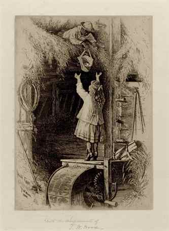 Etchings that depicted realistic or romanticized aspects of everyday life were widely popular with collectors. William Henry Lippincott's Stolen Moments (1888) shows a young woman at leisure, quietly reading a book. The subject's dress and surroundings identify the sitter with the well-heeled women who might decorate their homes with such a print. Nostalgic works like Thomas Waterman Wood's Fresh Eggs (1882), in which two children gather eggs from a barn, were poignant reminders of daily life in bygone eras and the disappearance of the rustic farming lifestyle.(above: