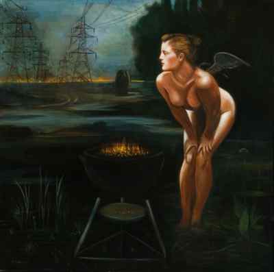 (above: Edith Vonnegut, "Weber Grill and Angel in Power Lines" 2005, oil on linen)