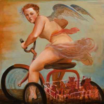 The "Weber Grills" of the title refers to a series of five nocturnal paintings in which muscular angels warm themselves over the round, modern grills, finding a bit of light and warmth on foreign terrain. The "Dainty Things" category is something of a catch-all. It includes seven paintings that imitate toile fabrics, with each of the vignettes borrowed from Vonnegut's own paintings past and present; several small portraits of girls; two self-portraits of the artist flying over the landscape; and such whimsy as an angel riding a bicycle with a basket of little devils on the back. The latest sea life to suffer from a carelessly discarded six-pack holder is a beleagured mermaid, her wrists handcuffed by the plastic rings.