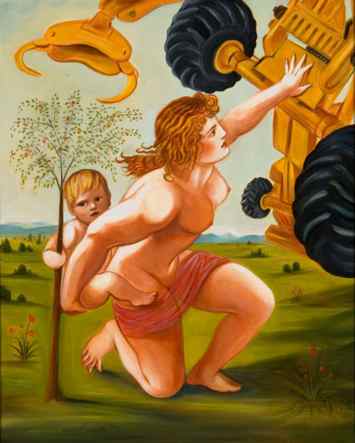 Vonnegut previously had a one-person exhibition at the Cahoon Museum in 1993. At that time, her two sons were young, and her paintings featured her "Domestic Goddesses," as she called them, female figures who did household chores with all the grace, dignity and nudity of a classical Aphrodite. Thirteen years later, most of her protagonists are simply women albeit exceptionally strong and powerful ones or, sometimes, angels. Instead of dirty floors and dishes, their major enemy is development and other threats to the landscape. In works like "Saving the Sapling," the heroine protects a child and a tree, holding off a piece of heavy equipment with one hand. In "The Last Crop Will Be Asphalt," an angel stands at the end of a road and lifts an earthmover over her head.