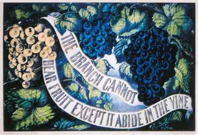 The prints are grouped into five categories: botanical prints, mythological and religious themes, harvest themes, social satires, and early advertising illustrations and diagrams. These categories emphasize the variety of the diverse pieces. For example; the hand-colored lithograph by an anonymous painter printed by Currier & Ives is a 19th century American Piece simply named The Branch Cannot Bear Fruit Except It Abide in the Vine. (see right) It stands out with its rich colors and eye-catching graphics. According to ExhibitsUSA; "the grapes pictures are allegorical or symbolic biblical passage. John 15:4-5 compares the growth of a grapevine to the spiritual growth of a Christian. Currier & Ives dominated the nineteenth-century market for affordable and attractive art for the American home. This lithography firm decorated America's walls. The firm's prolific and diverse output, some 7,000 different published topics, points to the varying values and interests of its American clientele. The many religious prints that Currier & Ives produced, such as this one, point to the strong religious tenor in the country."
