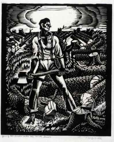 (above: Charles Turzak, Young Abe Lincoln Enters Coles County, Illinois, (also titled Young Lincoln Felling Trees), woodcut, 1934. Purchase, Gift of Mrs. Newton E. Tarble)