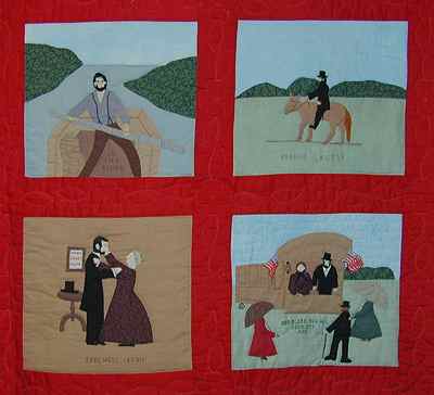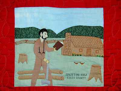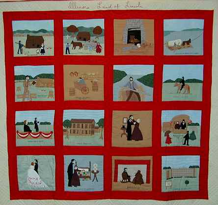 The appliquéd and embroidered quilt by Moore depicts 16 different events and locations from the life of Abraham Lincoln. Moore designed and created the individual story quilt blocks and then joined them together to form the quilt. Included are two panels that refer to Lincoln's time in Coles County Lincoln splitting rails for his father Thomas' cabin at Goosenest Prairie, and saying goodbye to step-mother Sarah Bush Lincoln prior to leaving for Washington, D.C., to become President. The quilt was created about 1992 and is on loan from Moore's son and daughter-in-law, Darrell and Randi Moore.