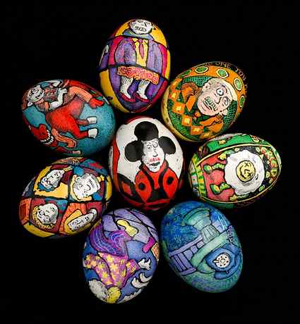 (A collection of eggs decorated by Roz Chast; Photo by Paul Mutino, from Being, Nothingness and Much, Much More: Roz Chast, Beyond The New Yorker (8/7/14)