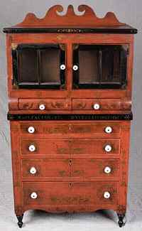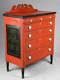 This chest of drawers represents Soap Hollow furniture at its best. Its bright red color and bird decoration combine with the classic scrolled backboard, kite-shaped escutcheons, drop-centered skirt and finely turned legs to present a piece that incorporates the individuality of the maker with tradition of form.)
