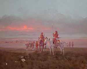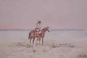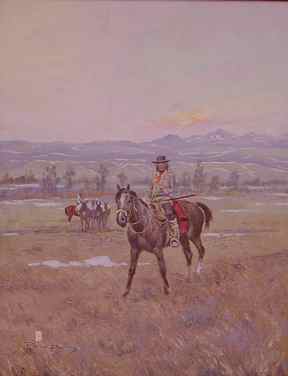 Ace Powell spent most of his life in Montana. He was raised in Apgar and spent summers working as a wrangler in Glacier National Park. There he watched Charlie Russell paint at Bull Head Lodge on Lake McDonald. Powell modeled Russell's styles in his own art career, painting and sculpting traditional images: cowboys, Indians, rugged western landscapes, horses and range animals. He was prolific, creating an estimated 12,000 - 15,000 paintings and sculptures during his lifetime. (right: Ace Powell (1912-1978), Indian in Snow)