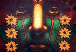 A group of American Ojibwe paintings was significantly compelling. Fawn, a contemporary 44x30" Prismacolor pencil on paper drawing was a tour de force piece. Myriad brilliantly solid colored free-form shapes wove compactly to coalesce into a face with headdress and clouds massing above -- this was the larger theme. Evidence of elements important to this human image was seen in subdivisions of space -- shell, lightning, tree, wolf, spider, skull, fire, pattern, butterfly, to name some of them. These motifs fully ranged the background space, closely encroaching the figure. Artist, Frank Big Bear created the piece from 2002-04.