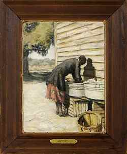 It was not uncommon for an artist painting in the south to use the ubiquitous country cabin with laundry drying in the sun as a means to express an idealized vision of the rural, agrarian life. This subject was compelling for a number of reasons: it was readily available, it offered some prospect of salability, and allowed them to put forward their virtuosity in a particular media, as with pastels in the case of Charleston Renaissance artist Elizabeth O'Neill Verner (fig. 3), or the oil on board genre paintings of William Aiken Walker. (fig 4.) In these cases laundry is atmospheric, almost incidental.
