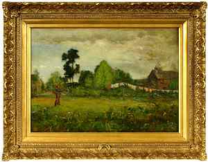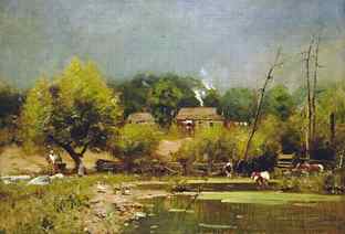 There were indeed painters who chose to view wash day as a somewhat less delightful, though no less visually compelling undertaking. The paintings of three artists working well into the twentieth century remind us that the inhabitants of these bucolic settings still washed their clothes in a cast iron pot or tin wash tub. Eugene Thomason, a student and later colleague of George Luks, spent much of his career recording the mountain people of North Carolina (fig. 5). Thought to be the "Ashcan artist of the Appalachians," Thomason recorded these scenes with great empathy, realizing that his subjects were poor in a traditional sense but not without character and a distinct culture. Amelia Montague Watson is another artist who chose to record some of daily life in the southern mountains. She painted with a group of artists working in Tryon, NC and has recreated the steaming reality of the task at hand (fig. 6). Still one almost misses the pig rooting at our laundress' feet because the eye is drawn to the mountain background. Finally, Richard Bryan's "Monday Morning" (fig. 7) conveys a sense of the isolation and strenuous labor that attended agrarian life on John's Island, near Charleston, SC.