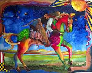 "My Canvas is silk, my palette is the west." So states Nancy Dunlop Cawdrey, who has taken the ancient art of Chinese silk painting and made it her own, embellished it with her strength, hope and experience, telling her story with each broad brush stroke, each color transition, each border legend. She calls it the "jazz" of painting, when she blends sometimes discordant notes of color and form into an exciting concept that captures the spirit of painting as much as her subject matter. The paintings are alive -- and they are rendered with liveliness and a practiced knowledge of her medium.