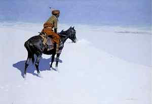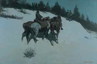 Increasingly after 1900, Remington's work became both more introspective in subject matter and more ambitious in terms of technique and the sophisticated handling of color. This period of his career yielded many of his best-loved works. The Clark's Friends or Foes? (The Scout) is a striking example of how Remington constructed scenes that allowed him to experiment with broad expanses of minimal color producing desolate vistas that have aesthetic and emotional repercussions. Emptied of dramatic physical action, paintings like Trail of the Shod Horse (Princeton University Art Museum) and A Reconnaissance (Private collector) convey mystery and a sense of danger looming just beyond the frame of the canvas or on the far horizon. In comparison to his earlier work, the threat is less obvious and imminent, more psychological than physical.