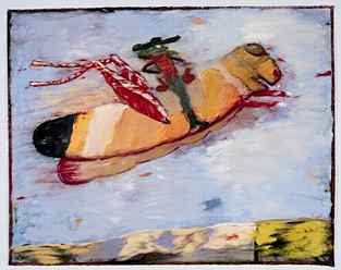 WSU Museum of Art Director, Chris Bruce says, "Hansen has lived in rural Eastern Washington since 1957 when he joined the faculty of Washington State College, and yet his paintings have been seen all over the world. Still, he remains an under-recognized artist of vast talent and emotional range, who follows a deeply American expressive and eccentric tradition of artists such as Red Grooms, H.C. Westermann and Philip Guston. He has created that most difficult of all artistic accomplishments -- combining a serious, edgy painting style with humor and personal narratives that allow both art connoisseurs and every day folk to enjoy and appreciate his art." (left: Gaylen Hansen, Kernal Riding Grasshopper, 1999, oil on canvas, 48 x 60 inches)