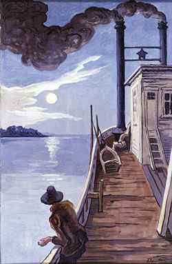 In his later years, Benton developed a growing environmental awareness-participating in campaigns to prevent the damming of the Buffalo and Missouri rivers by the U.S. Army Corps of Engineers -- in order to save some of the waterways that he'd so long admired. Whether capturing the natural beauty of the waterways or the colorful characters associated with them, Benton's watery iconography recorded a uniquely American way of life that in many places was also in peril. (left: Thomas Hart Benton (American, 1889-1975), "Different kinds of moonlight change the shape of the river,"Study for Mark Twain's Life on the Mississippi, ca. 1944, Gouache and watercolor on paper, 7 x 4 1/2 inches. The State Historical Society of Missouri, 1966.0100. Courtesy of the Limited Editions Club, New York Art © T. H. and R. P. Benton Testamentary Trusts/UMB Bank Trustee/Licensed by VAGA, New York)