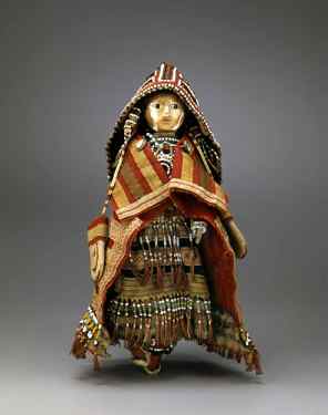 This doll is from the Northeast and represents the creative range of doll making in the region. The doll wears clothing made of elegant materials derived from European designs rather than native ones, with the exception of the doll's hood. Based on the high quality of the beadwork, the clothing worn by the doll reflects those likely used for ceremonial occasions.