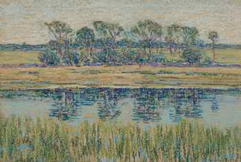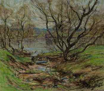 White's dedication to the poetic sensibility of the paysage intime is critical to understanding his fascination with pastel. The medium's subtlety and capacity to suggest a range of moods allowed him to hint at something more profound than mere observation of nature. In White's finest work, one critic noted, "there is a mysticism, a haunting poetic quality that stirs the senses like a Poe story or an Ibsen play." Artist James McNeill Whistler's landmark work in pastel also encouraged White to create dreamy landscapes with his colored pencils.
