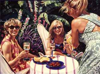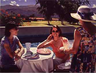 Hall, a southern California artist, developed a distinctive style of painting that presents the sun-saturated world of Southern California women. Her paintings are inspired by the artist's visits to Palm Springs' pools and resorts and Los Angeles' posh Westside and beaches. Depictions of privileged, beautiful women grinning with self-satisfaction against the inevitable ravages of time became the basis of Hall's imagery. Employing a realist style of painting, the artist celebrates the color and quality of light in sunny environments. Yet, these emotionally charged works pack compelling thoughts for viewers who choose to look beyond the pretty faces and scenes. Beneath the surface beauty lurks a certain "edge" evoking an uneasy feeling that something is amiss. In revealing herself through these poignant and personal images, the artist lures us into deeper consideration of our own yearnings for eternal youth and our inability to face what inevitably comes with human mortality.