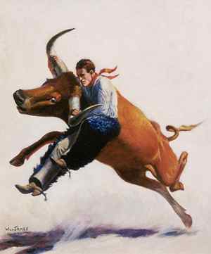 James quickly wrote and illustrated four books published in the 1920s -- Cowboys North and South (1924), The Drifting Cowboy (1825), Smoky (1926) and Cow Country (1927) -- and became a celebrity. (left: Will James, Cowboy Steer Wrestler, 1922 oil on canvas. Cover illustration for pulp magazine "Action Stories. The Hays Collection)