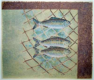 (above: Grace Clements (1905-1969), Three Salmon,ca. 1940, Study for The Mosaic Mural for Long Beach Airport, Gouache on paper, 13-7/8 x 16-1/8 inches. Long Beach Museum of Art, Purchased with funds contributed by Ewel and June Grossberg)