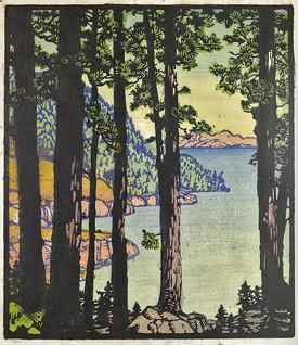 (above: Frances Gearhart, Glimpse of Big Bear Lake (Autumn Brocade), Color Block Print, 1931, 12 x 9 1/4 inches, Private Collection)