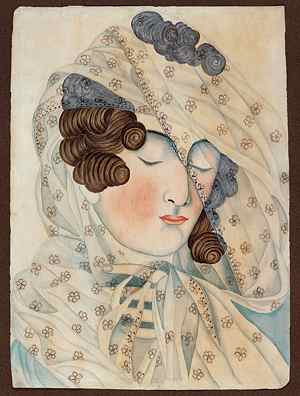 Portrait painting throughout the nineteenth century was largely produced by male artists. Not only was there a long history of men as portrait painters, it was also not deemed appropriate for a woman to participate in an itinerant lifestyle. One rare exception, represented by a small watercolor of a family group, Mr. and Mrs. Lyman Day and Daughter Cornelia, was Deborah Goldsmith, who painted to support herself and her "aged parents." When she traveled in western New York State she was usually accompanied by a family member or trusted religious leader. Female artists through the mid-nineteenth century, however, created pastels, miniatures, or watercolors that were meant as tokens of friendship or as gifts for family and friends. Emily Eastman's delicate Woman in Veil, a watercolor c. 1825, was probably inspired by a print source, possibly a fashion plate of the neo-classical period.