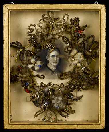(above: Artist unidentified, United States, Hairwork Wreath in Shadow Box, c. 1860-1880, Human hair and pencil on pasteboard mat in shadowbox, 10 3/4 x 8 3/4 x 2 1/2 inches. Collection American Folk Art Museum, New York. Gift of Kendra and Allan Daniel. 2009.10.1. Photo by Gavin Ashworth, New York)