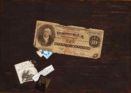 John Haberle combined masterful technique with sly, witty historical and personal references to American life in his paintings. Alluding to the moral and political issues of the time, Haberle's trompe l'oeil (meaning to "fool the eye") paintings juxtapose newspaper clippings, tickets, and money with objects such as a pocket watch, playing cards, and rosary beads. The slight but ingenious details make each of Haberle's paintings entertaining and complex. Haberle's precise work was under-recognized during his lifetime. Afterward, he faded into complete obscurity but was rediscovered in 1949 by American scholar Alfred Frankenstein. Despite the fleeting fame during his lifetime, today Haberle is considered one of the most accomplished American trompe l'oeil painters alongside William Michael Harnett and John Frederick Peto.