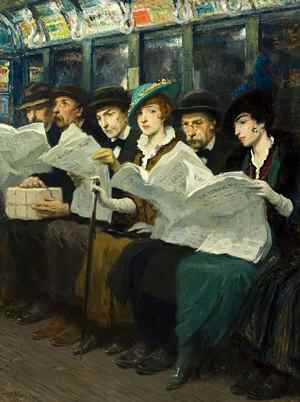 catch; the tired slouch of office workers heading home on the subway, noses