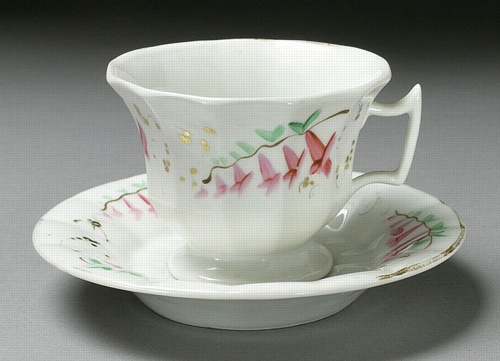 (above: William Ellis Tucker (United States, active 1826-1832), William Ellis Tucker Factory (United States, Pennsylvania, Philadelphia, 1826-1838), Cup and Saucer, c. 1828-34, porcelain, painted, Cup: 2 7/8 x 4 1/4 x 3 5/8 in. (7.3 x 10.8 x 9.21 cm); Saucer height: 5/8 in. (1.58 cm); Saucer diameter: 5 3/4 in. (14.61 cm), Los Angeles County Museum of Art, gift of Mr. and Mrs. Robert L. Grim, M.2000.101.1e-f. Public domain, via Wikimedia Commons*)