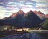 Left to right: Noonday -- Skagway, 16 x 20 inches, oil; Smuggler's Cove, Skagway, 16 x 20 inches, oil; The Wilderness Shrine, 16 x 20 inches, oil; The Midnight Sun -- Skagway, 16 x 20 inches, oil; Alaska Harbor Night, 16 x 20 inches, oil.