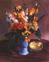 Left to right: Potted Geraniums, oil on canvas, 24 x 28 inches; Still Life in Lavender - Zinnias, oil on canvas, 20 x 24 inches.
