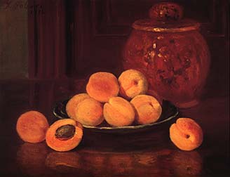 Above Center: Mount San Antonio - Old Baldy, c. 1910-15, 9 1/4 x 13 5/8 inches; Apricots, 1912, oil on cardboard, 11 x 14 inches