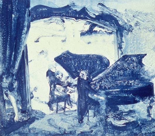 From top to bottom: James McGarrell, Refleted Piano, 1993, monotype and oil pastel, 27 x 30 inches; James McGarrell, Figurines and Big Blue Vase, 1990, monotype, watercolor and oil pastel, 26 x 39 inches; James McGarrell, Plume and Yellow Singer, 1994, monotype, watercolor and oil pastel, 26 x 39 inches
